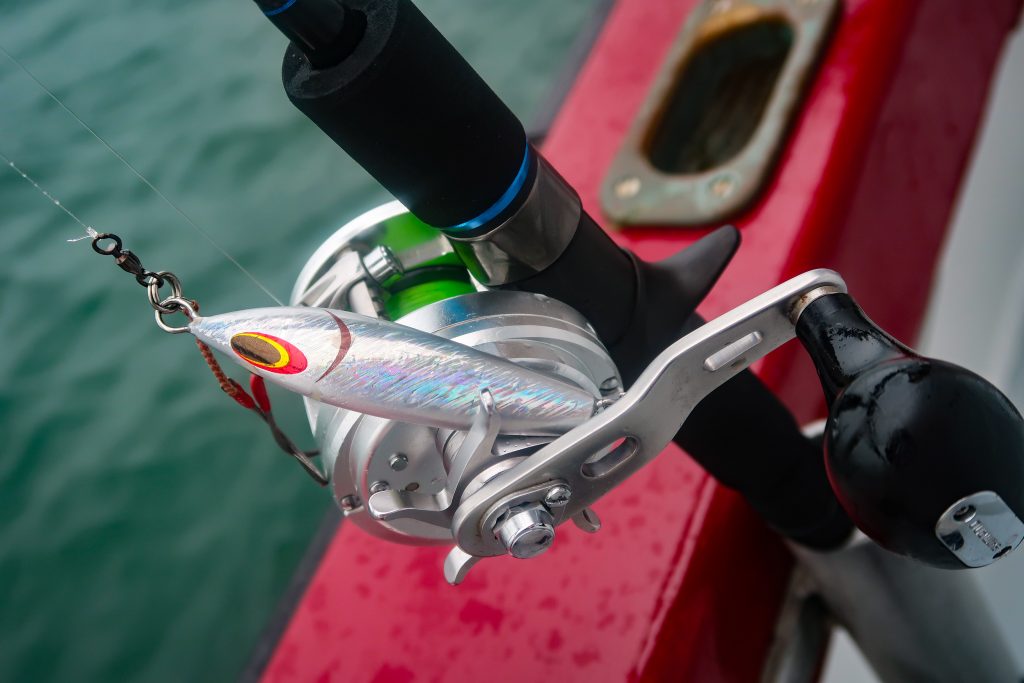 To get the best action out of these jigs requires the proper rod, which is extremely lightweight, looking more like a largemouth bass rod than one capable of beating a tuna. A slow-pitch rod has a leisurely, even recoil that lifts and then “pitches” the jig with a just a full turn of the reel handle. The rod, more so than the angler, imparts the action to the jig, which makes slow-pitch jigging far less labor-intensive than speed jigging. Fishermen tend toward lighter braided line while slow-pitch jigging to reduce water resistance and maintain a vertical presentation.