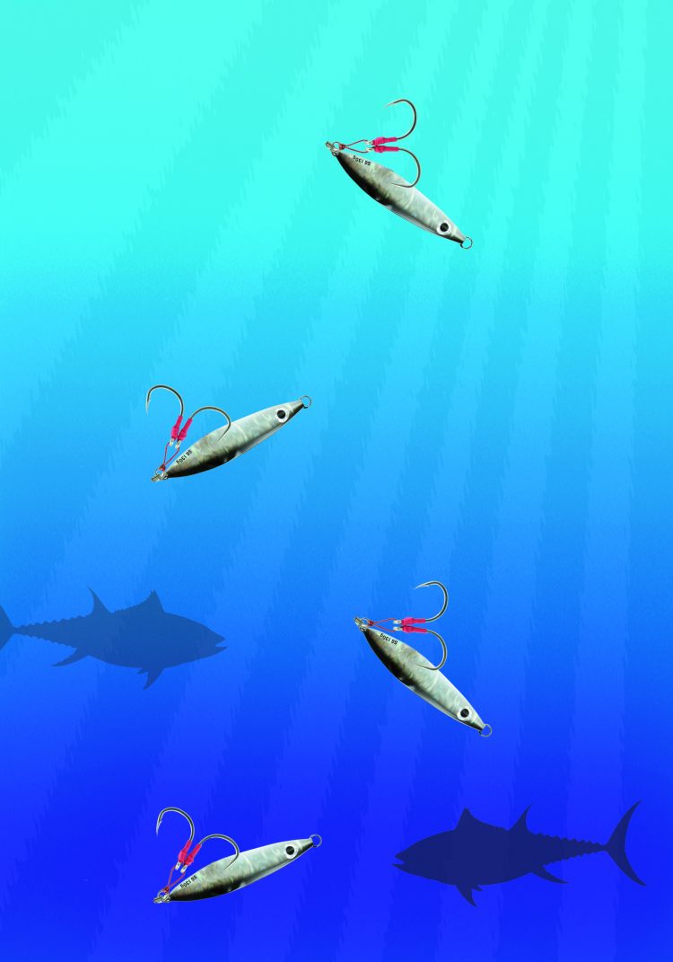 While slow-pitch jigging is very effective on bottom fish, hungry pelagics won’t let a fluttering jig pass by them either. Chris Parisi of Tsunami Tackle, put Tsunami’s slow-pitch offerings to work on school bluefin tuna last summer. With the fish feeding on sand eels just off the bottom to midway through the water column, 15- to 60-pound tuna were perfect targets for slow jigging with slender, sand-eel-imitating jigs that fluttered enticingly on the fall.