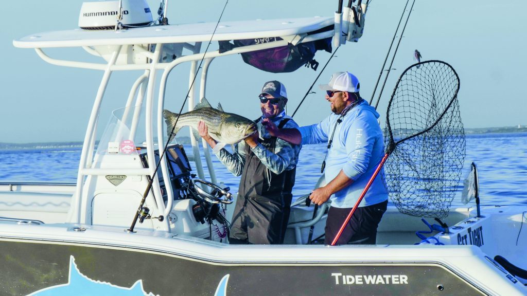 Boston’s best big-striper fishing is fueled by an abundance of Atlantic menhaden. I’ve had many memorable trips in that “dirty water,” and almost all of them began with making bait. That was not so on my first time fishing with Captain Brian Coombs of Get Tight Sportfishing Charters. We set out past the harbor islands, with Brian locked on his electronics, looking for schools of what he calls “pelagic stripers.” These groups of big fish roam through the middle of the water column, hunting bait over water as deep as 100 feet. They move quickly, and getting on them requires coordination between the captain at the helm and the angler on the bow.