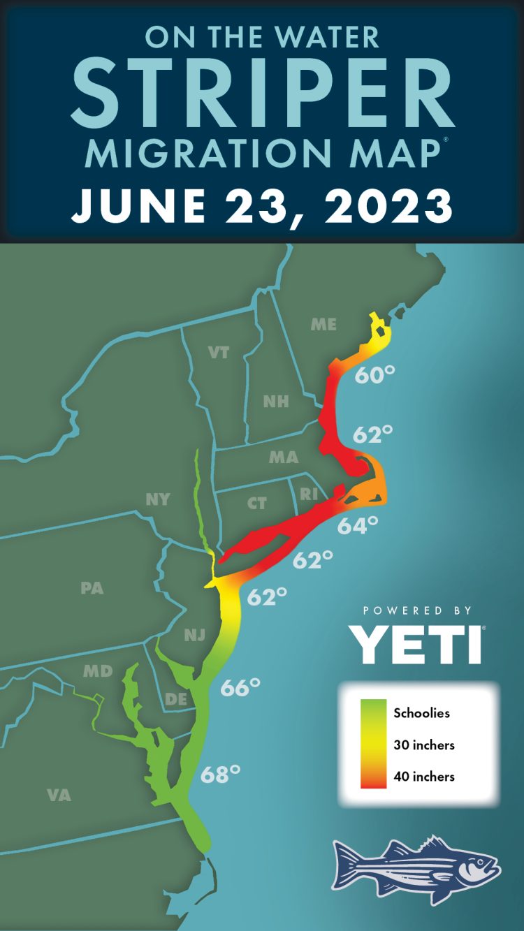 There are good numbers of 40-inch fish already in New Hampshire and Maine, with more moving in. These larger fish seem to be concentrating around the schools of bunker.