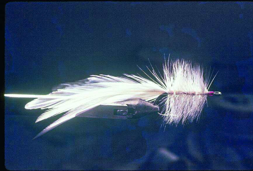 Looking back in time, the Tom Loving Bass Fly from the 1920s was an early pattern with a slow sink rate. It enjoyed great favor long before the term “suspending” was even in vogue. With a red palmered head and white bucktail for the tail, its roots go back to the 1890s. The Bass Fly name probably referred to largemouth bass, not striped bass, but it likely caught both in the brackish waters of the Chesapeake Bay and its tributaries.