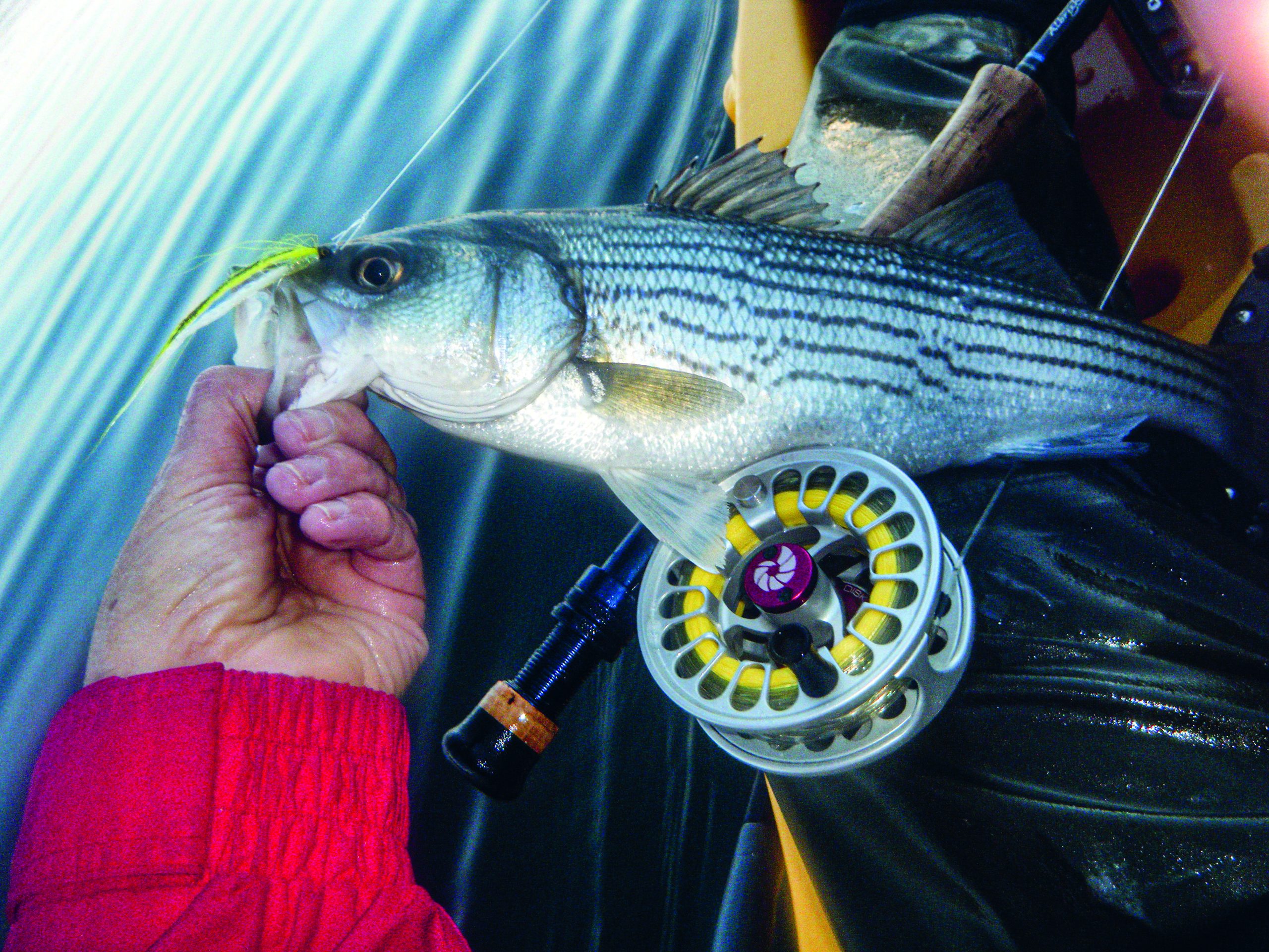 Good choices for suspending flies include Don Avondolio’s Enticer, Ray Bondorew’s Ray’s Fly, Jack Gartside’s Gurgler tied in reverse with the popper lips facing aft, and Gartide’s Beastmaster General. Other options include Bendback patterns, Lou Tabory’s Snake Flies, and shrimp patterns. Any of Ken Abrames’ patterns with a palmered hackle collar, like the Eel Punt, Katydid, Rusty River Rider, and RLS Snapper are New England favorites and work anywhere. A popper with the head tied in reverse like the FlyMan Slider or with a shortened head (like a Bob’s Banger with a half-inch-long head or a shortened Blados Crease Fly) can also be fished just under the surface. There’s no shortage of possibilities and many can be found in Angelo Peluso’s Saltwater Flies of the Northeast, plus Google and YouTube for online information. Fly shops like River Bay Outfitters and The Saltwater Edge can provide hands-on tying tips for salt-minded freshwater versions of suspending flies.