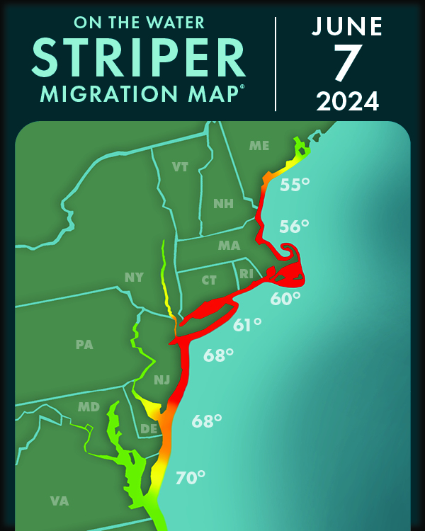The reefs of Long Island Sound load up with big bass as Hudson and Chesapeake fish converge on the sound. The fishing gets spotty in New Jersey as warming temperatures push the bass north. Fishing at Block Island, Boston Harbor, and Montauk ramp up as the fish settle in, while some stripers continue to swim toward Maine, where anglers at the northern edge of the striper’s migratory route experience another great summer of fishing.