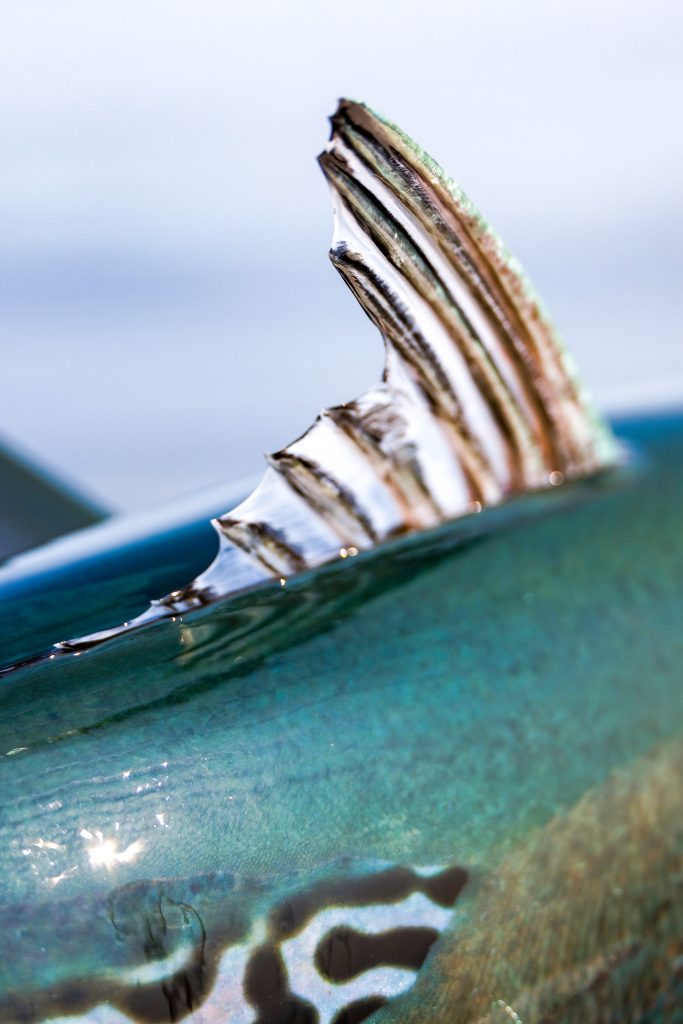 By now, you should recognize a recurring theme with fins and see the similarity with an albie’s dorsal fin at its topmost surface. This fin provides horizontal stability, like the fletching of an arrow. It also has a high-aspect ratio and fits into a sulcus that resembles a slit on the top of the fish. Think of a stiletto-style switchblade knife, with a blade that fits into the handle and can pop out with the push of a button.