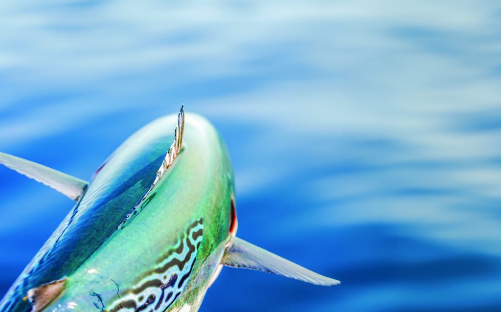 The pectoral fins are just behind the gills, along the horizontal midline of the albie’s body. They stabilize the fish horizontally and can change its direction from swimming vertically, allowing it to quickly dart to the surface to grab an anchovy and then zip back down to safety. These appendages also have a long and thin high-aspect ratio that are effective without adding much drag. Each one can be retracted to fit into a narrow depression called a sulcus, allowing the fin to recede, becoming flush to the skin of the rest of the fish’s body and further reducing drag when traveling at high speeds.