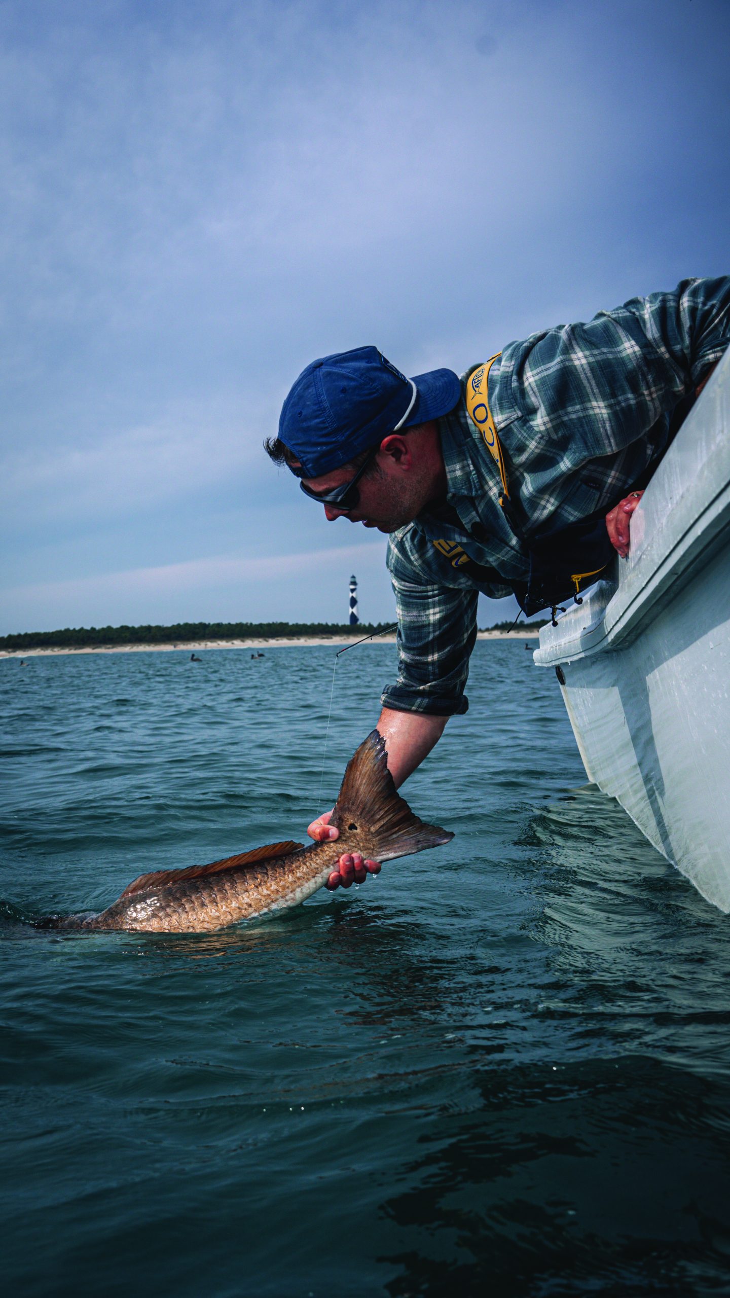 My next cast yielded another drum. A few minutes later, we tripled up. Over the next two hours, we lost count as fish from 35 to 45 inches scarfed our jigs off the bottom on nearly every cast. At one point, I hooked a fish that ran further and fought harder than all the others. It refused to come within 20 feet of the boat for several minutes until, finally, it rolled onto its side, and I grabbed its tail. In wide-open bites, whether with stripers, tuna, albies, or drum, the catches can all blend together if you aren’t careful. On the lucky occasions when I experience fishing that good, I try to slow down a little and fully appreciate the moment rather than rushing to make the next cast. After removing the jig from the fish, I leaned over the gunwale for a moment, watching the golden late-fall light ignite the scales of the 50-inch drum catching its breath next to the boat. The fish kicked free of my grip, breaking the spell as it splashed back toward the shore, where the Cape Lookout Lighthouse was keeping a steady watch over the drum, the bunker, and the fishermen as it had for the past 170 years.