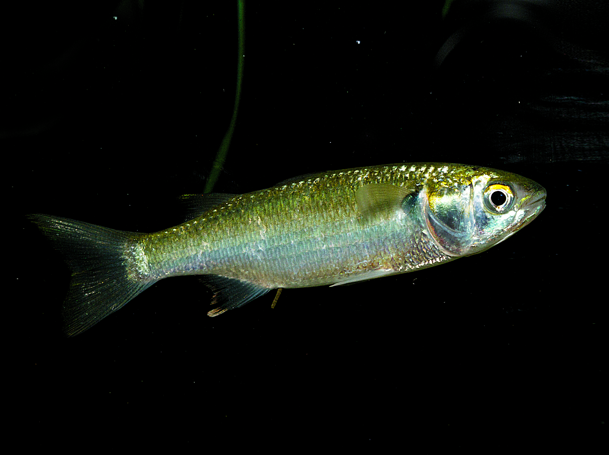 The energy sources fueling this impressive run are the countless numbers of baitfish that flood from the protection of the bays into the open ocean. One of the first baitfish to make this treacherous journey is the mullet. Mullet will swim in tight schools and are often observed grazing on the bottom, on the surface of vegetation, and even at the surface of the water. Mullet feed primarily on zooplankton and detritus. In the Northeast, it is possible to find two species of mullet—striped and white. Although they can get fairly large in the southern part of their range, with white mullet reaching 15 inches and striped mullet reaching 36 inches, we rarely see mullet in our area larger than the length of a finger—hence the name finger mullet.