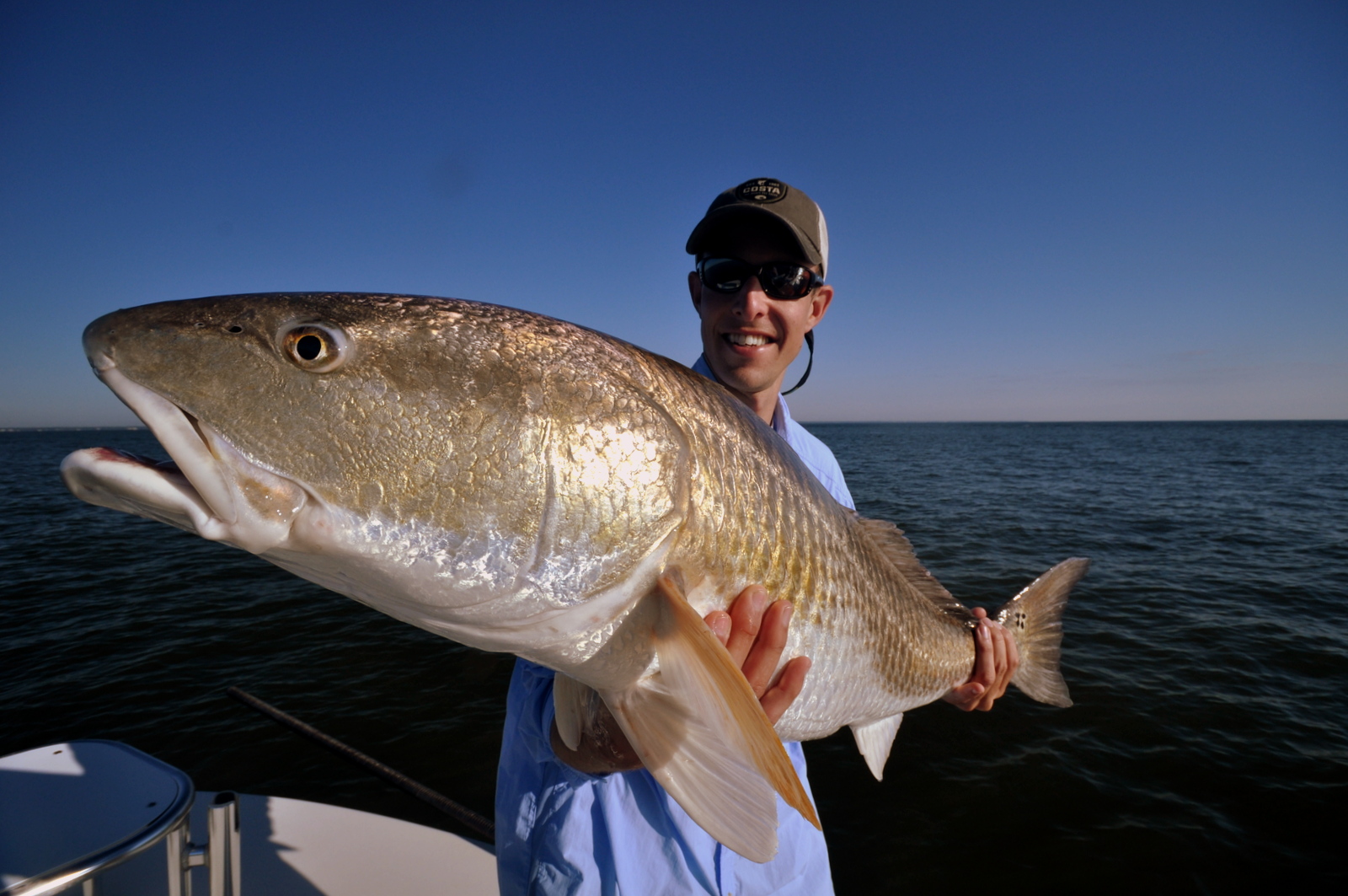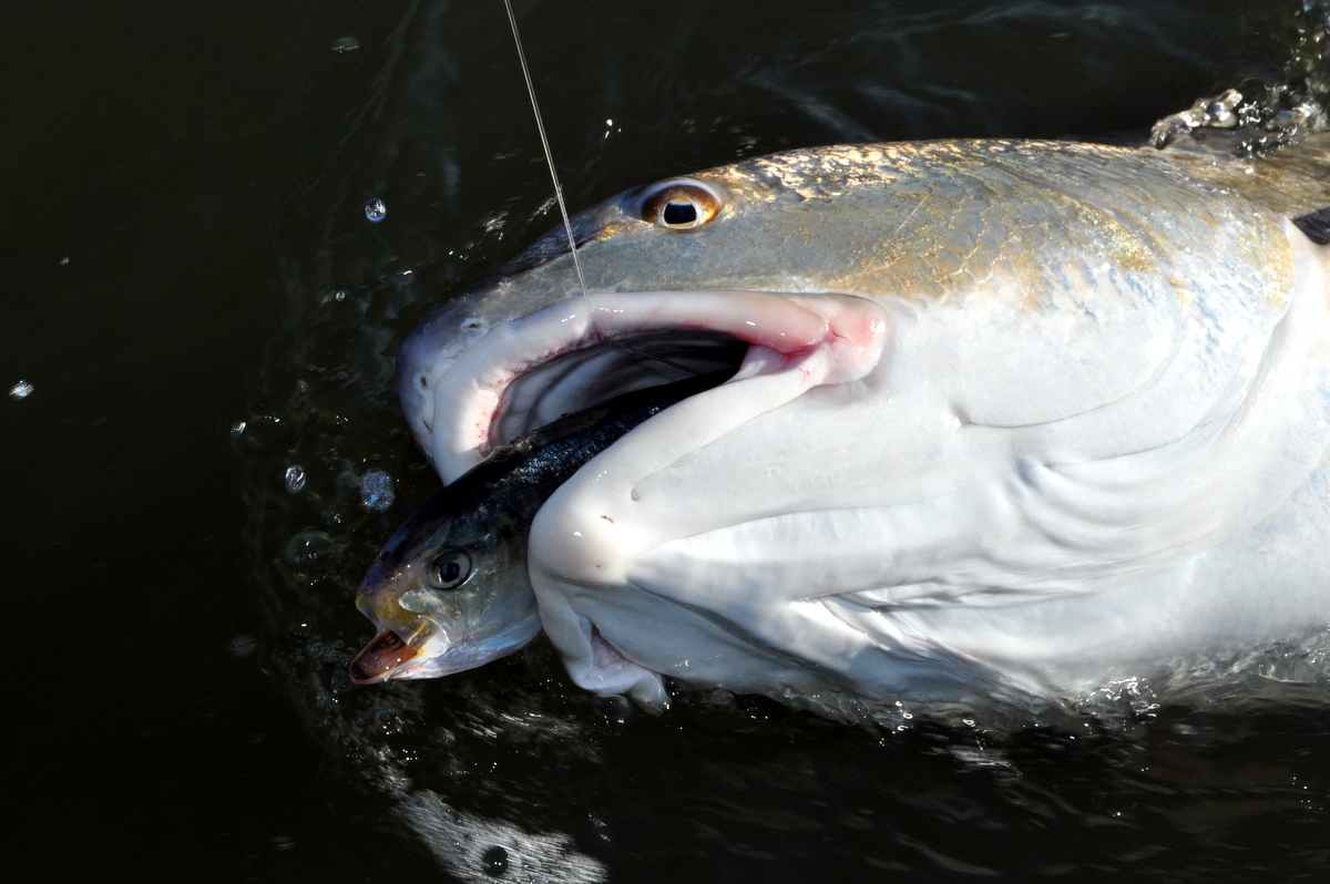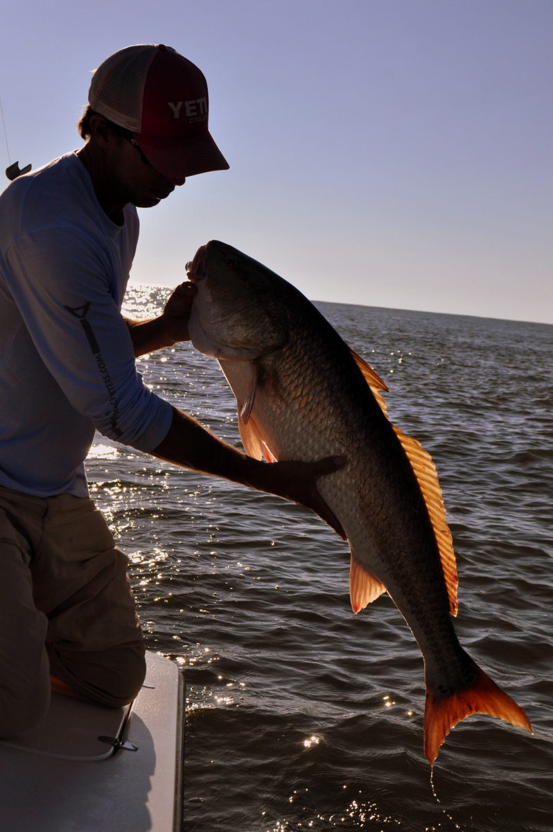 A big redfish makes another dash for the bottom, throwing water in all directions with its copper-colored tail.