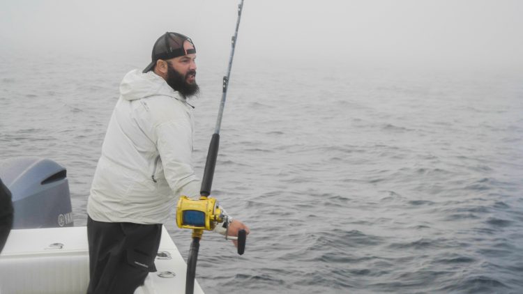 The 80 starts squealing, and we all realize at the same time—fish on! We immediately jump into our roles: Chris on the rod, Jimmy clearing the lines, and me taking the helm.