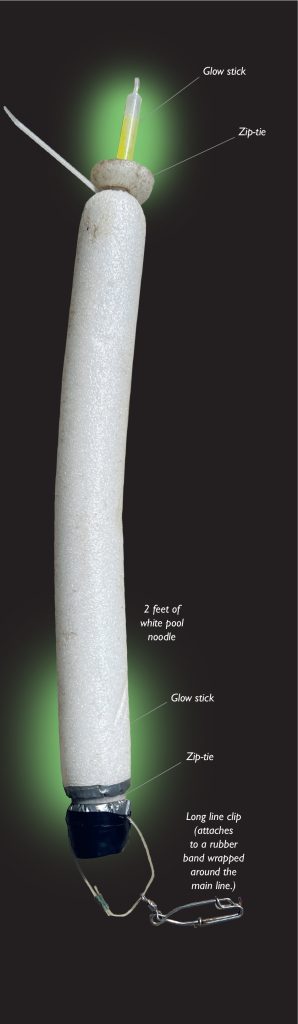 The pool noodle has also found a home in the offshore fishing scene for nighttime swordfish. When a swordfish takes a bait, it will often swim away from the weight, which means it will rise towards the surface. This clever contraption has a glow stick inserted inside the top and the bottom of the noodle. It will float vertically, but if a fish takes the bait and rises to the surface, the float will fall to a horizontal position, indicating a bite.