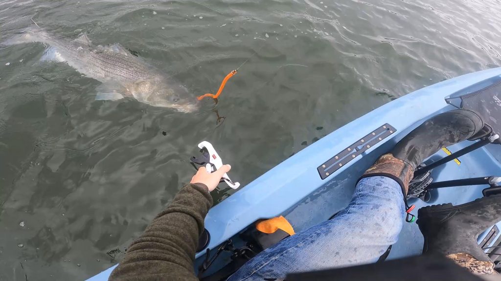 In recent years, flutter spoons have become popular and are particularly effective around adult bunker pods on the South Shore, as are large spooks on topwater. When you’re really looking for that big, trophy-sized striper, though, throw a live bunker on a circle hook. Alternatively, and this one is for my kayak brethren, one of the most effective lures for targeting large fish is the tube and worm. I scarcely catch a fish under slot size on the tube. Whether the bigger stripers think it’s a giant sand eel, the mother of all sandworms, or maybe they just hate it and want to kill it, the tube gets the job done and effectively eliminates smaller fish for me. Because the tube works best trolled at a super-slow speed (1.5 knots or less, in my experience), kayakers have a distinct advantage, especially with a pedal kayak. That speed is all you need for the tube to swirl and do its thing, then drag it over a boulder pile and get ready for a Northeast sleigh ride.