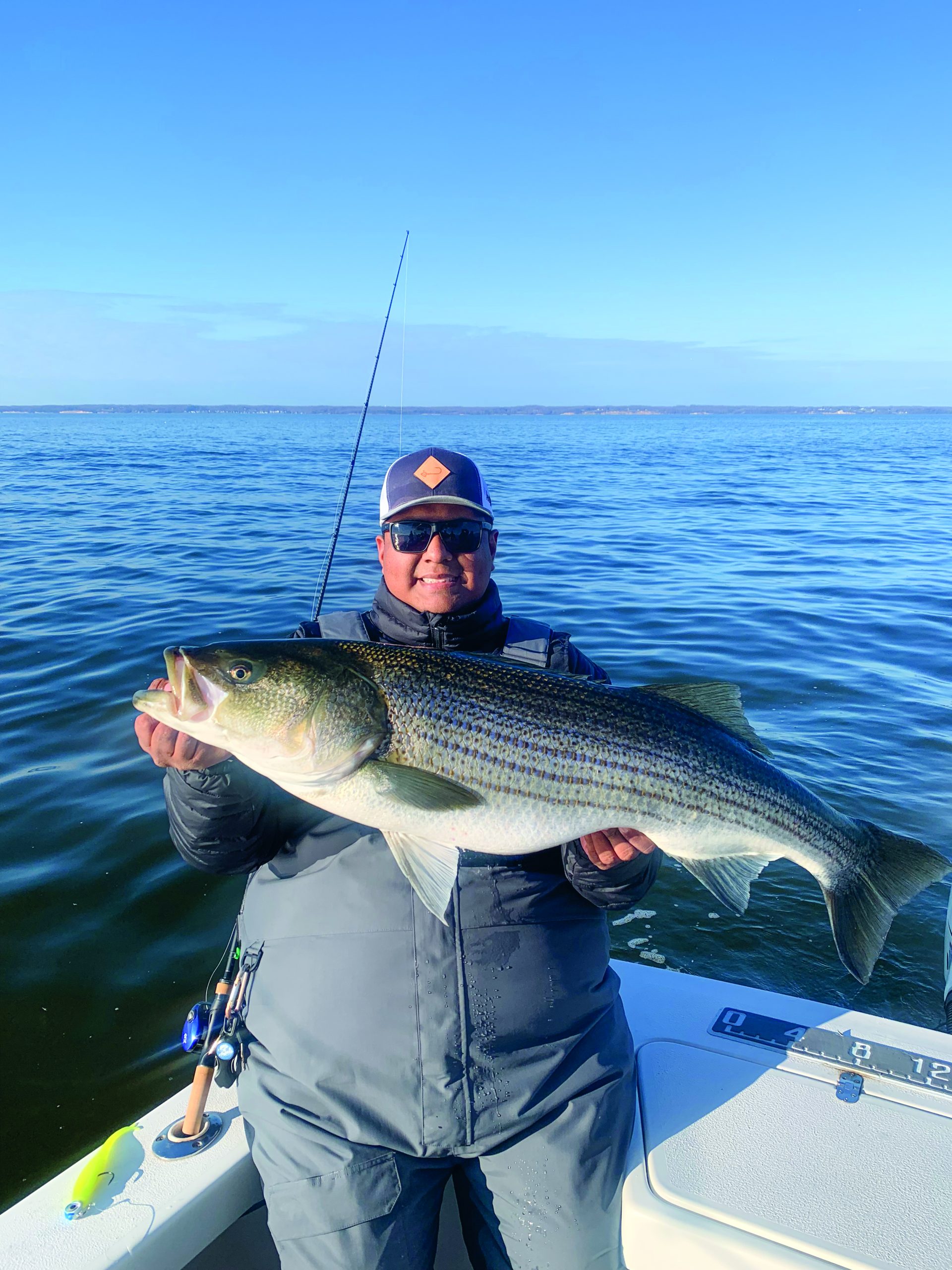 Striped bass head up the Chesapeake to stage around the spawning tributaries, and most anglers find them by looking for big schools of bait—you can almost always find some hungry striped bass looking for a meal. Keep in mind that it is a catch-and-release fishery in all of Chesapeake Bay from Virginia to Maryland waters. Some anglers bycatch striped bass while looking for blue catfish when fishing with cut bait the bottom, but others venture out into the Chesapeake’s open water and cover miles searching for striped bass feeding on schools of bunker. Fishing around the channel edges, shoals, and mouths of the rivers can be productive, especially on tide changes—times when striped bass move up the bay and eventually into the rivers to begin their annual spawn. Using jigheads paired with 6- to 8-inch soft plastics is what most local anglers use once they find a school of striped bass. Jighead sizes can range from 1 to 3 ounces, depending on how deep you’re fishing and how heavy the current is that day.