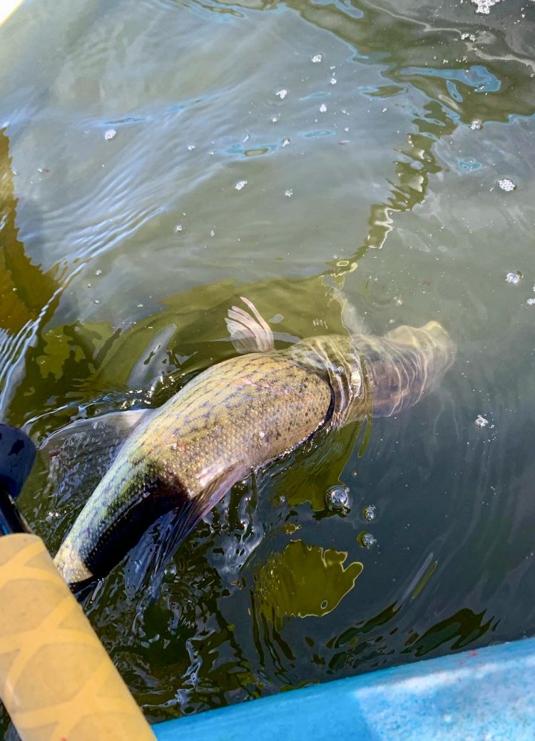 Ecstatic after only 2 hours of fishing, I began to paddle back to the launch. I threw one more yellow-perch-patterned floating Rapala Shad Rap SR05 and began to work it through the water column, using a few twitches and a long pause to allow it to rise.